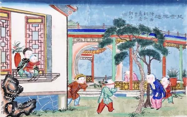 The New Year painting from the Qing Dynasty depicts children playing hide-and-seek. Collected by the Capital Museum.