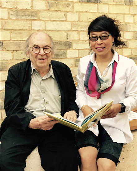 Yu Rong (right) shows her latest work to British illustrator Quentin Blake, an honorary professor of the Royal College of Art. [Photo provided to China Daily]