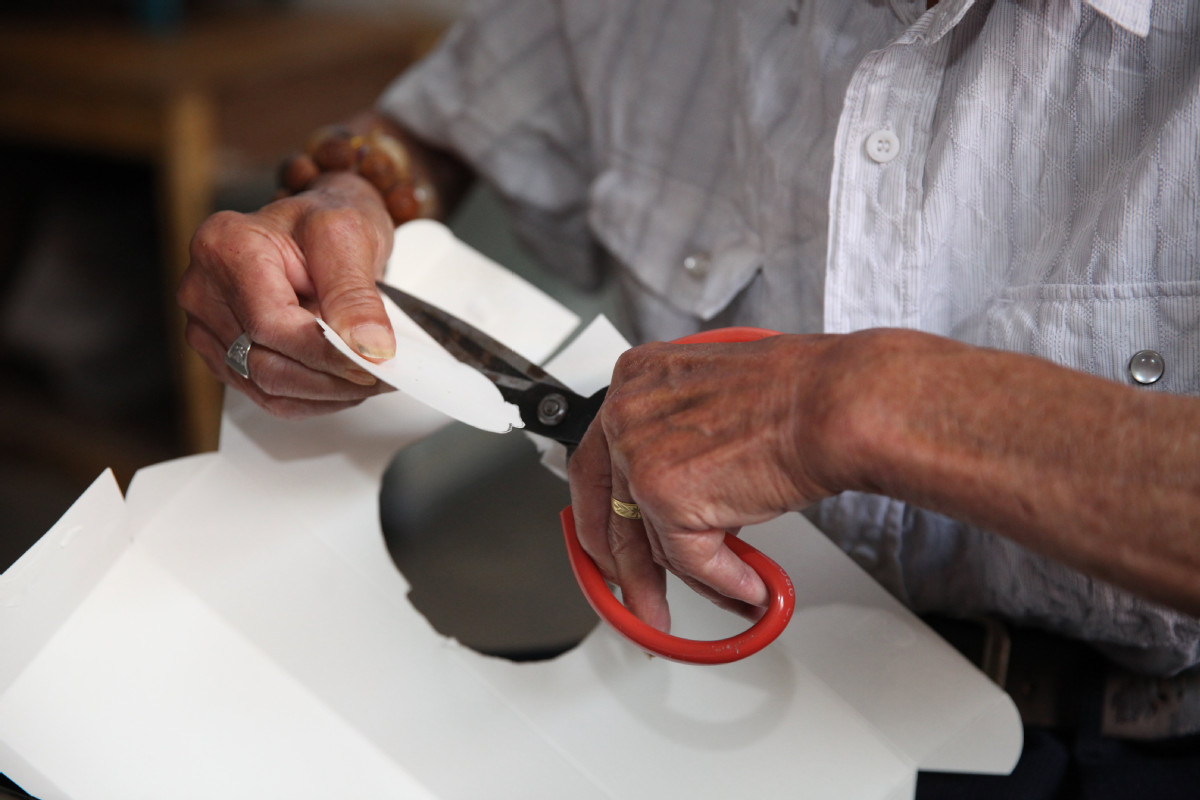 Zhang Fuli, 85, cuts the shape of a Peking Opera facial mask on a piece of paper. [Photo by He Ying/chinadaily.com.cn]