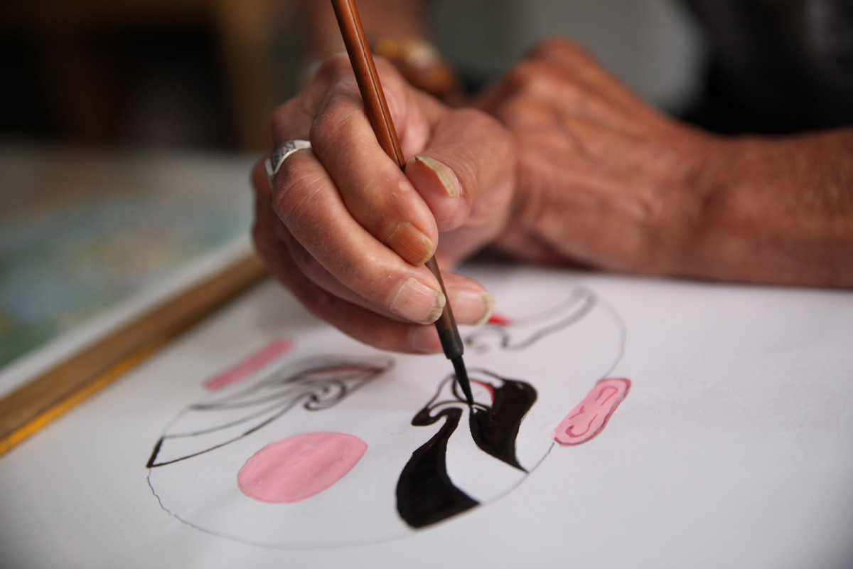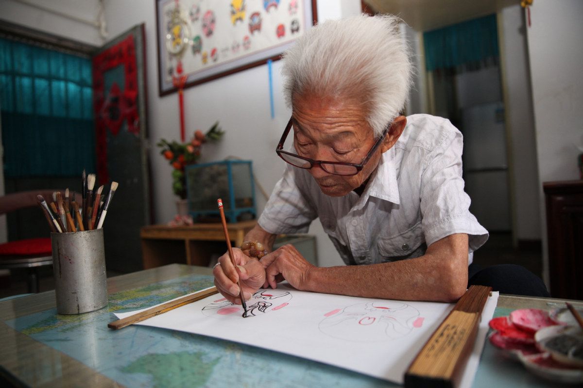Zhang Fuli, 85, draws a facial mask of Peking Opera at home in Zhangjiakou, North China’s Hebei province. [Photo by He Ying/chinadaily.com.cn]