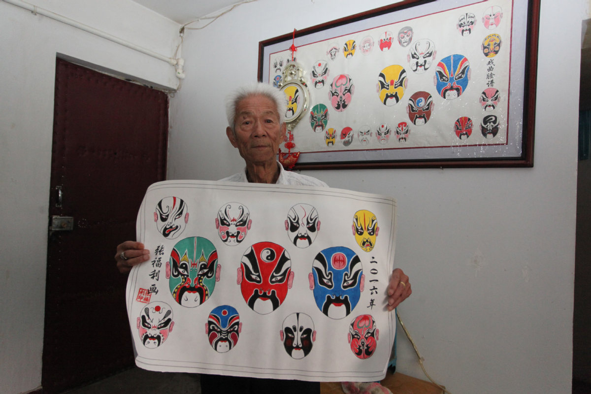 Zhang Fuli, 85, shows his painting works of Peking Opera facial masks. [Photo by He Ying/chinadaily.com.cn]
