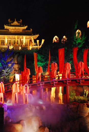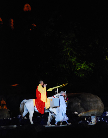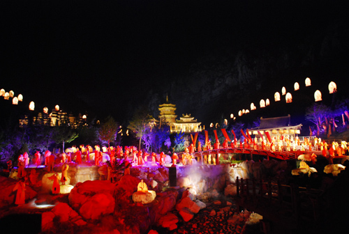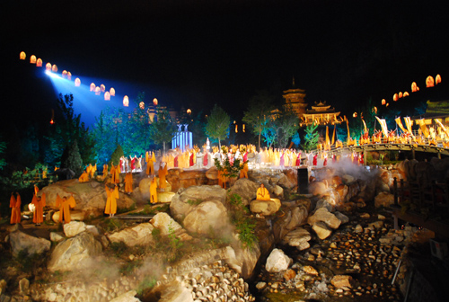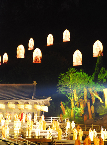 A music ritual entitled "Zen Shaolin" is staged in the Daixian Valley of the Songshan Mountain, near the Shaolin Temple in Central China's Henan Province, April 20, 2008. The show contains four parts: "Water Music," "Wind Music," "Lighting Music" and "Stone Music". [Chinadaily.com.cn]