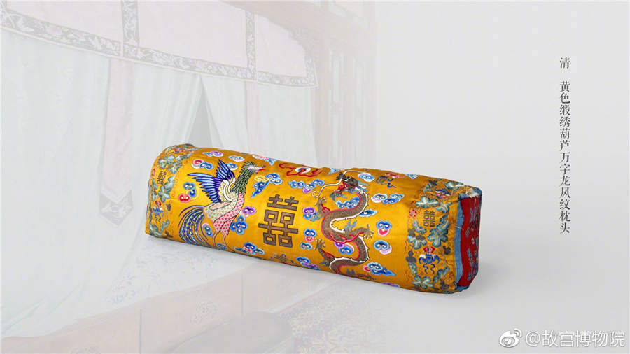 A yellow pillow embroidered with gourd, phoenix and dragon patterns from the Qing Dynasty. [Photo/Official Weibo account of the Palace Museum]