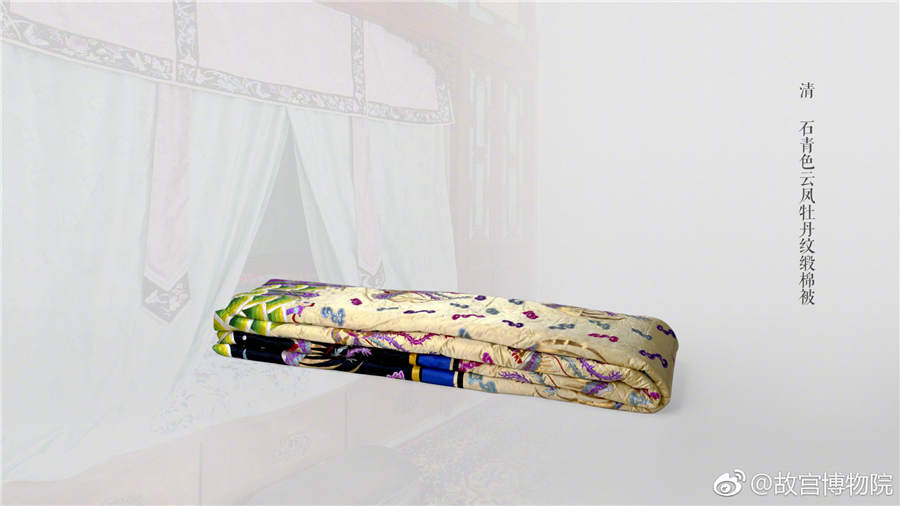 An azurite satin quilt decorated with cloud peony patterns from the Qing Dynasty. [Photo/Official Weibo account of the Palace Museum]