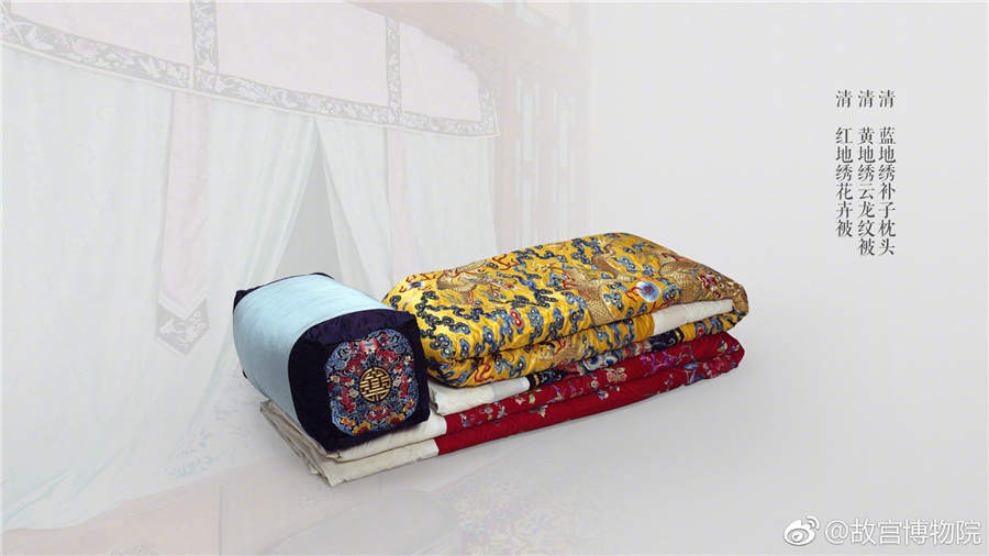 A red quilt embroidered with flower patterns from the Qing Dynasty; A yellow quilt embroidered with cloud dragon patterns; A blue pillow embroidered with buzi (animal or bird insignia indicating ancient officials' ranks) from the Qing Dynasty. [Photo/Official Weibo account of the Palace Museum]