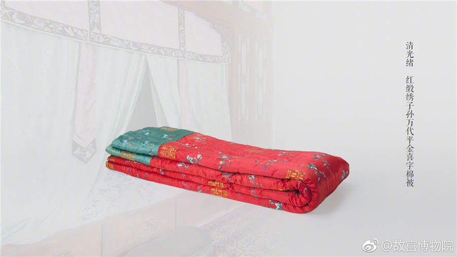 A red satin embroidered quilt decorated with Chinese character "shuang xi"(double happiness), from the Guangxu Period of the Qing Dynasty. [Photo/Official Weibo account of the Palace Museum]