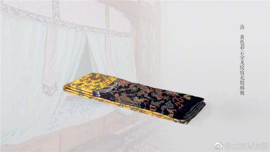 A yellow satin quilt decorated with colorful clouds and golden dragon patterns, from the Qing Dynasty. [Photo/Official Weibo account of the Palace Museum]