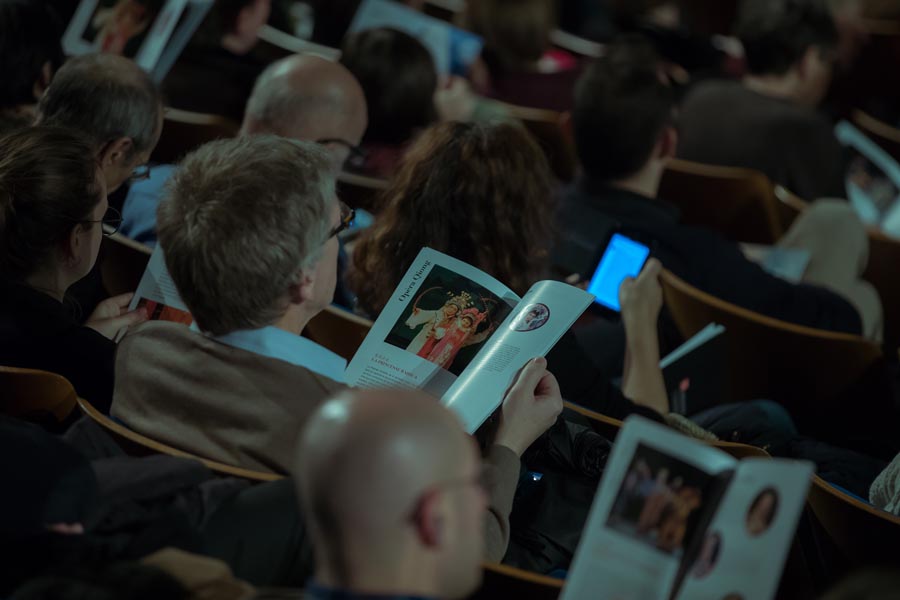 An audience member reads from the program for the 8th Traditional Chinese Opera Festival in Paris on Nov 26, 2018. [Photo/Chinaculture.org]