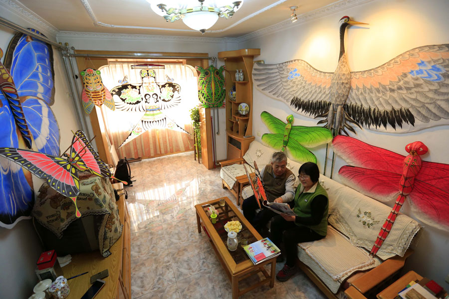 Kite enthusiast Fu Xianming's home in Shijiazhuang, Hebei province is full of self-made kites. [Photo by Zhang Haiqiang for chinadaily.com.cn]