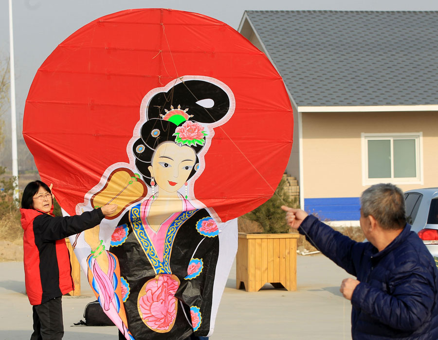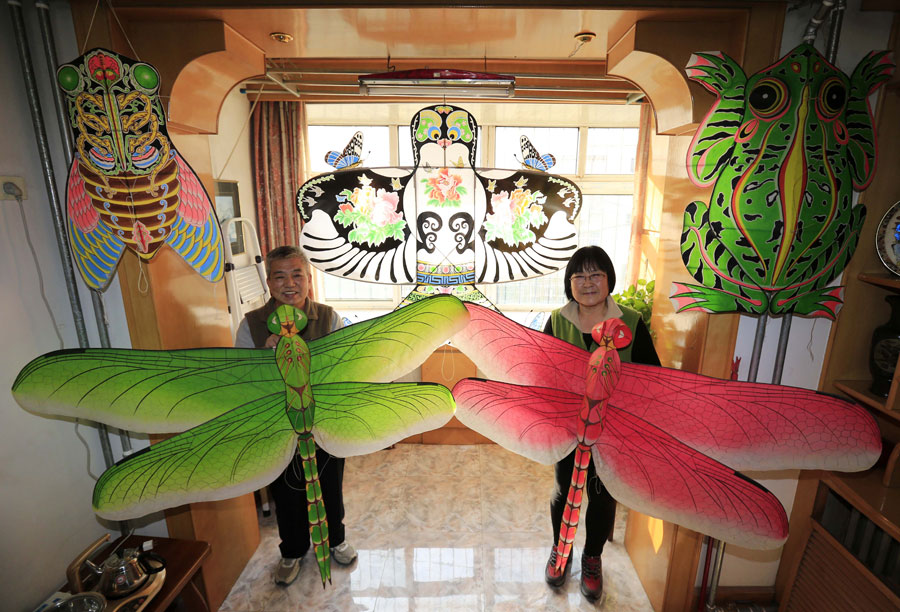 Kite enthusiast Fu Xianming and his wife display self-made kites in November in Shijiazhuang, Hebei province. [Photo by Zhang Haiqiang for chinadaily.com.cn]
