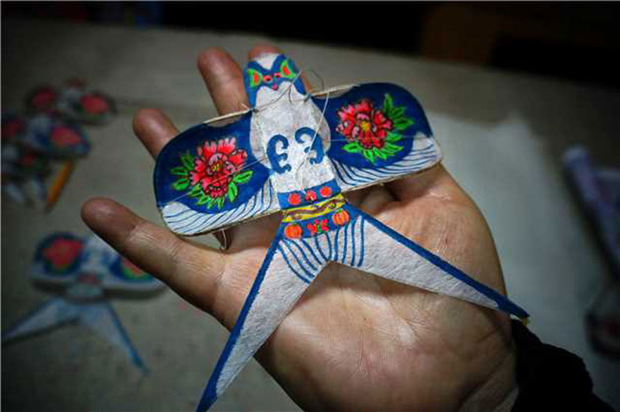 Kite enthusiast Fu Xianming displays one of his kites that's as small as his right hand. [Photo by Zhang Haiqiang for chinadaily.com.cn]