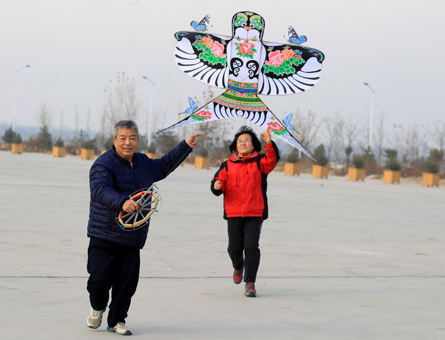 Kite enthusiast Fu Xianming flies a self-made kite with his wife in November in Shijiazhuang, Hebei province. [Photo by Zhang Haiqiang for chinadaily.com.cn]