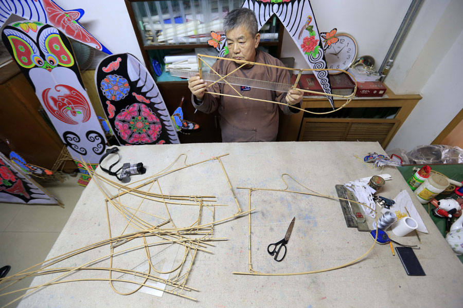 Kite enthusiast Fu Xianming in the process of making a kite in Shijiazhuang, Hebei province. [Photo by Zhang Haiqiang for chinadaily.com.cn]