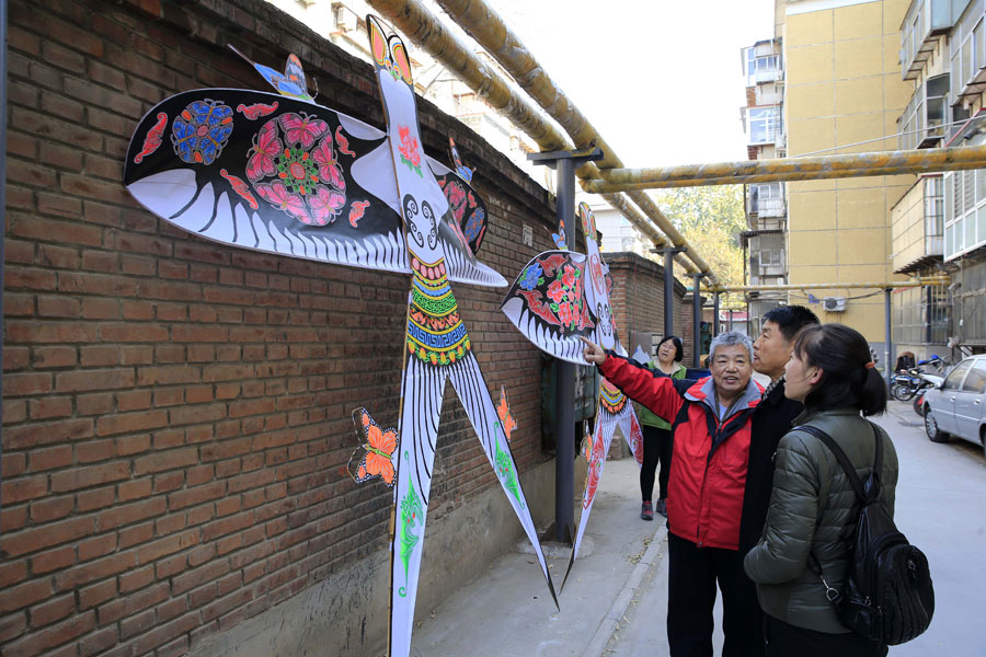 Kite enthusiast Fu Xianming shows his self-made kites to neighbors in Shijiazhuang, Hebei province. [Photo by Zhang Haiqiang for chinadaily.com.cn]