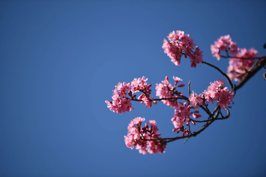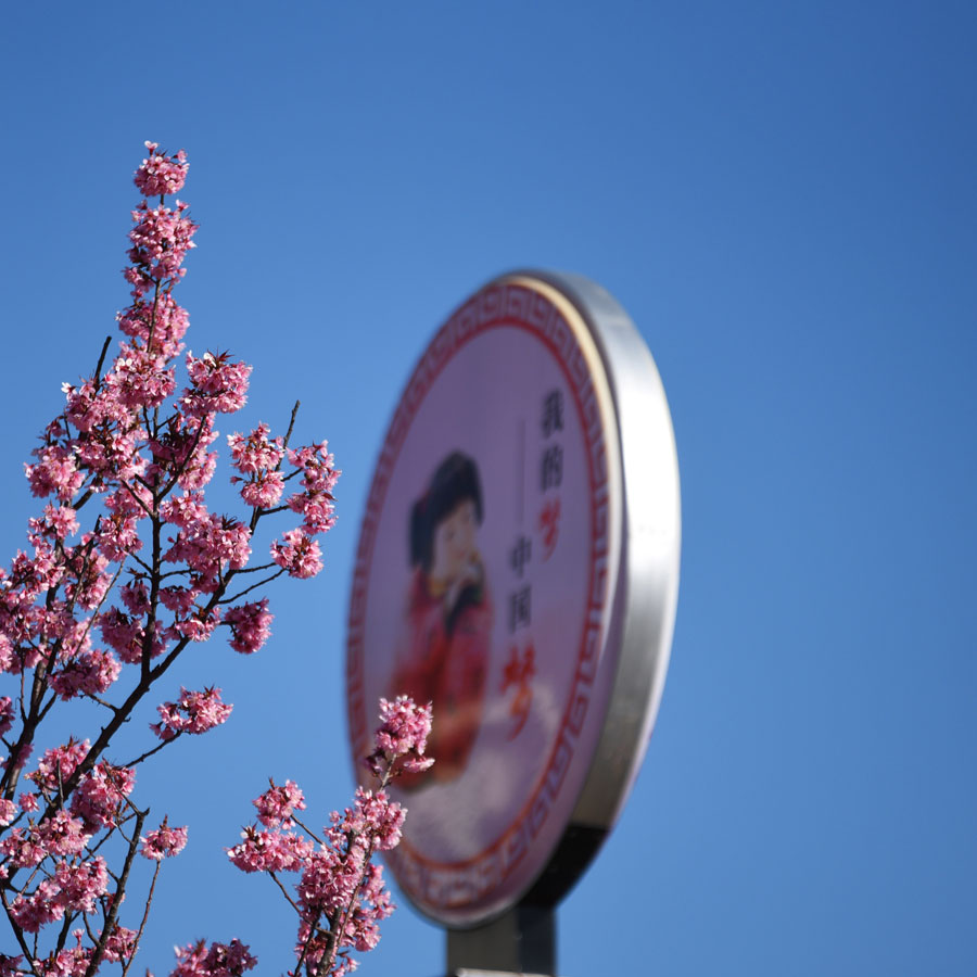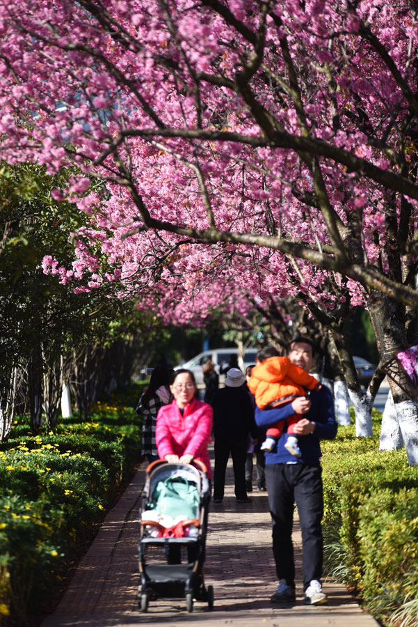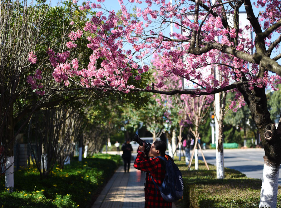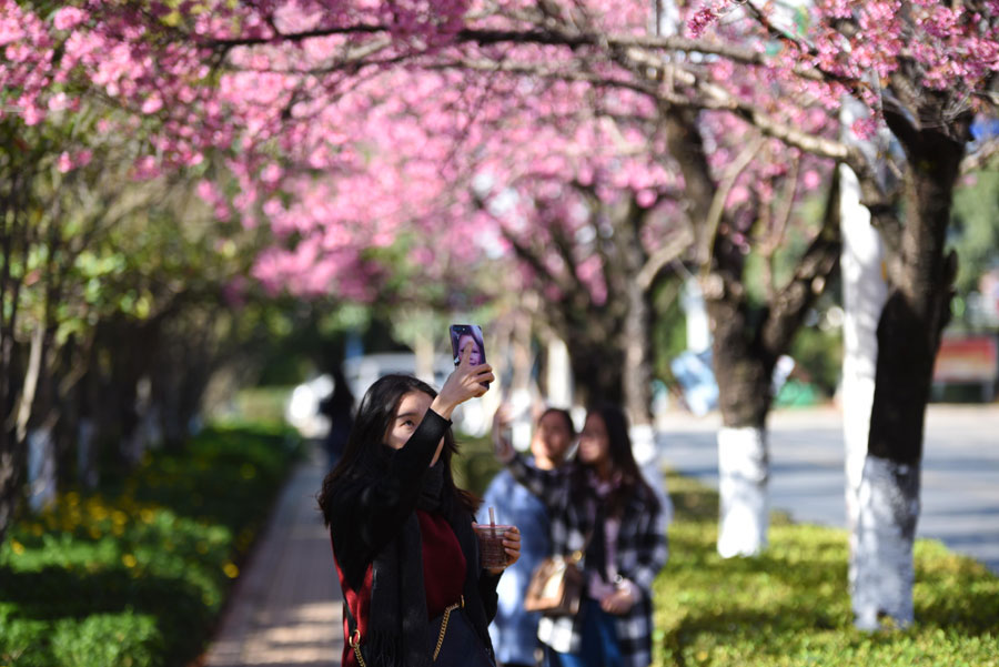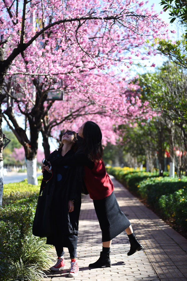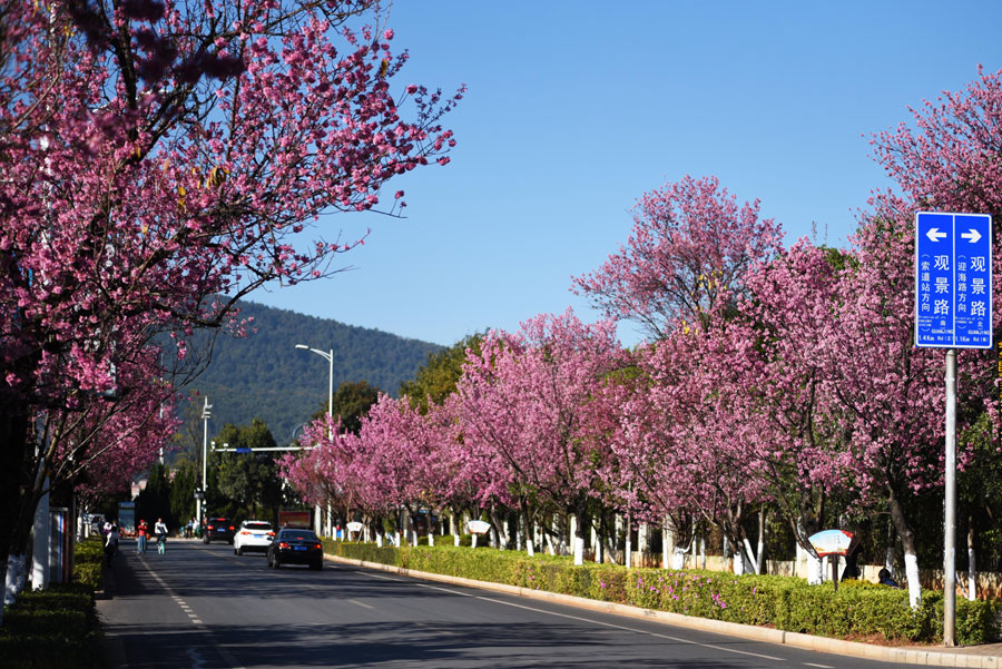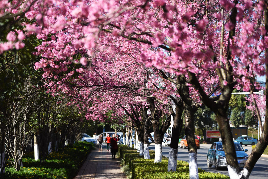 The 1.9-kilometers-long Hongta West Road in Kunming, capital city of Southwest China's Yunnan province, is attracting a lot of tourists, as over 600 winter cherry blossom trees are blooming. [Photo by Li Ming for chinadaily.com.cn]