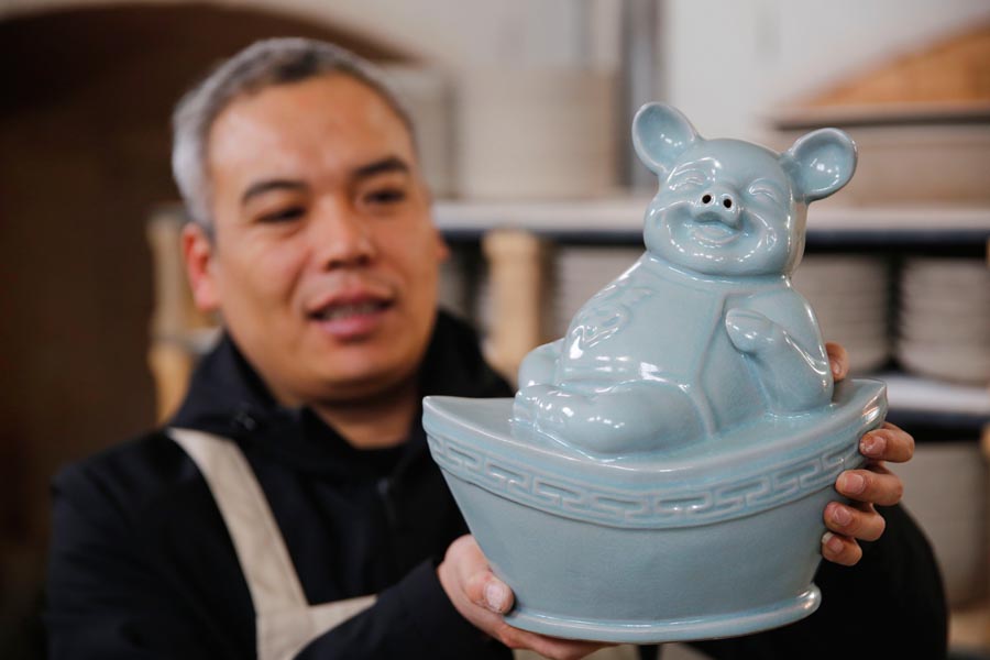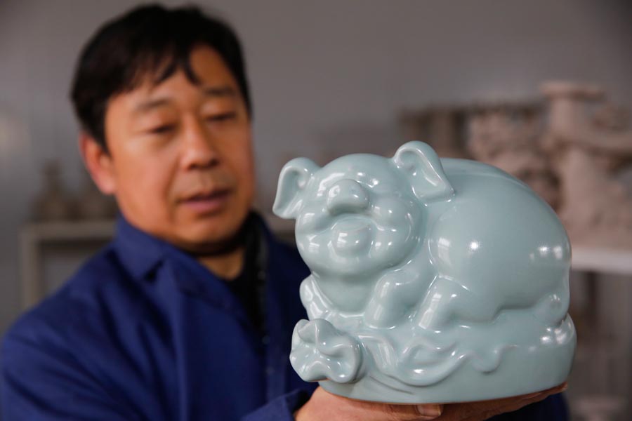A Ru porcelain pig is shown at the studio of Wang Guoqi in Baofeng county, Pingdingshan city, Central China's Henan province, Jan 7, 2019. Pig-themed porcelain works are being made there as New Year mascots to welcome the upcoming Year of the Pig in the lunar Chinese calendar. The lunar New Year falls on Feb 5 this year. [Photo by He Wuchang/Asianewsphoto]