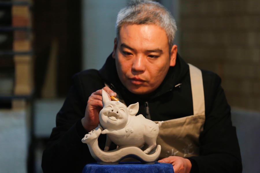 A man works on the base of a Ru porcelain ware shaped like a pig at Wang Guoqi's studio in Central China's Henan province on Jan 7, 2019. [Photo by He Wuchang/Asianewsphoto]