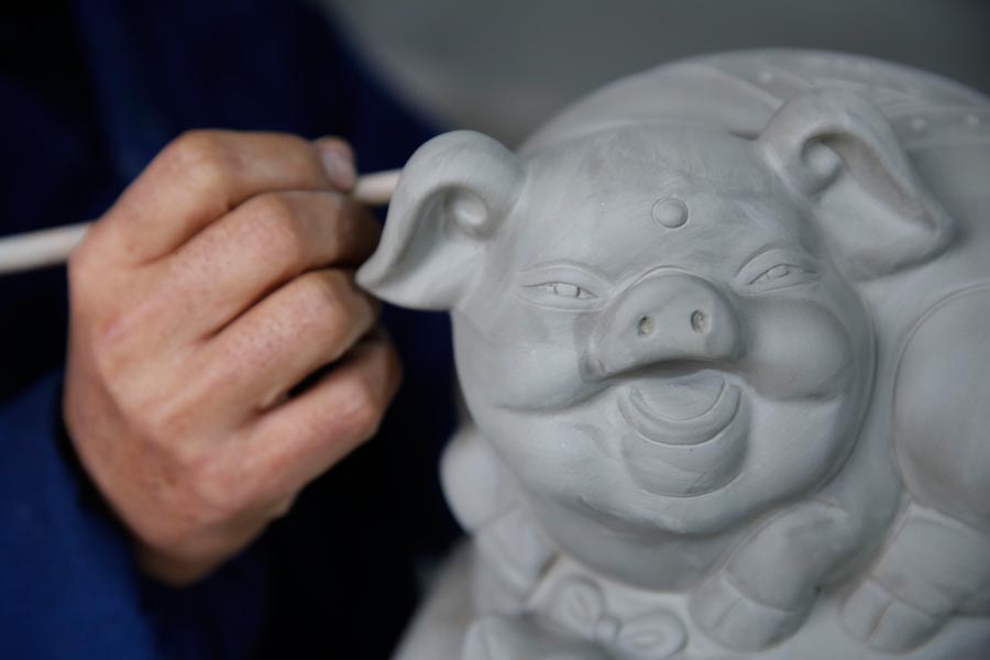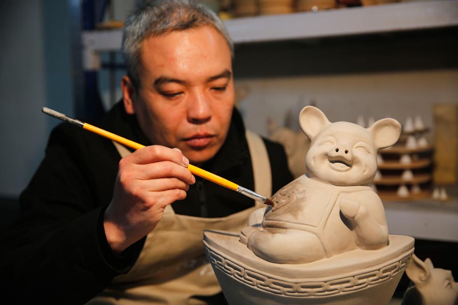 Craftsman Wang Guoqi works on the base ofa Ru porcelain pig in Baofeng county, Pingdingshan city, Central China's Henan province, Jan 7, 2019. Wang is an inheritor of Ru porcelain, one of China's "five great kilns" in the Song Dynasty (960-1279). [Photo by He Wuchang/Asianewsphoto]