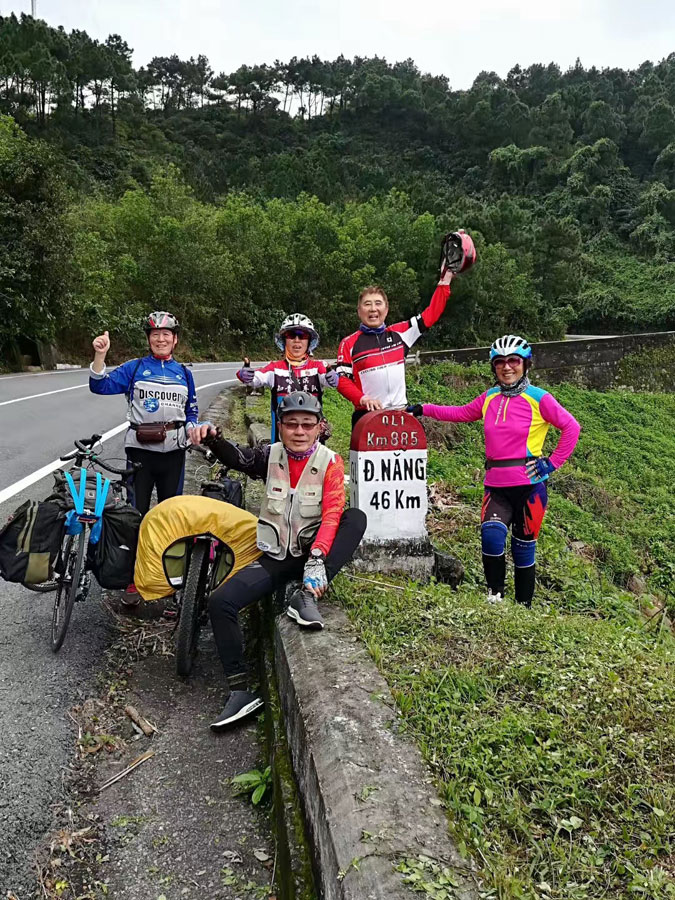 The six senior cyclists pose for a photo in coastal city Da Nang in Vietnam on Jan 24. [Photo provided to chinadaily.com.cn]
