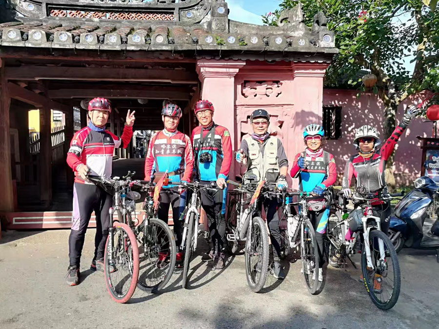 The six senior cyclists pose for a photo in Hoi An, a city in Vietnam, on Jan 26. [Photo provided to chinadaily.com.cn]