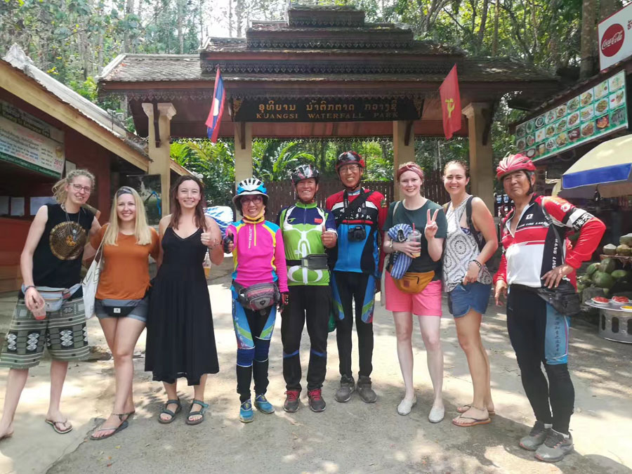 Han Qiming (first from right) and his fellow travelers pose for a photo with some foreign tourists in Luang Prabang, Laos on March 28. [Photo provided to chinadaily.com.cn]