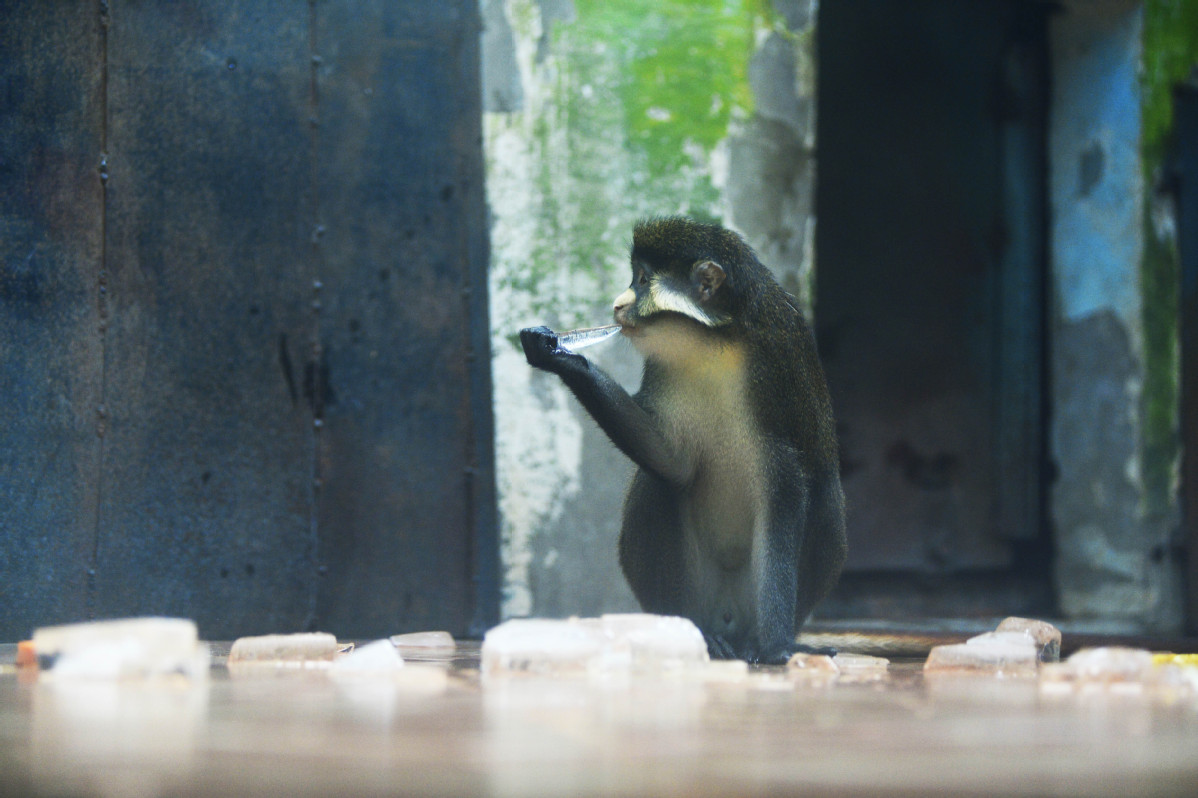 A monkey licks a piece of ice in Tianjin Zoo on July 4, 2019. [Photo by Shi Song/for chinadaily.com.cn]