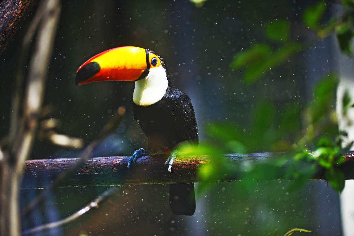 A toucan takes a shower to cool itself off at Tianjin Zoo. [Photo by Shi Song/for chinadaily.com.cn]