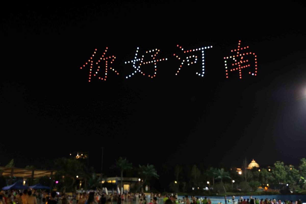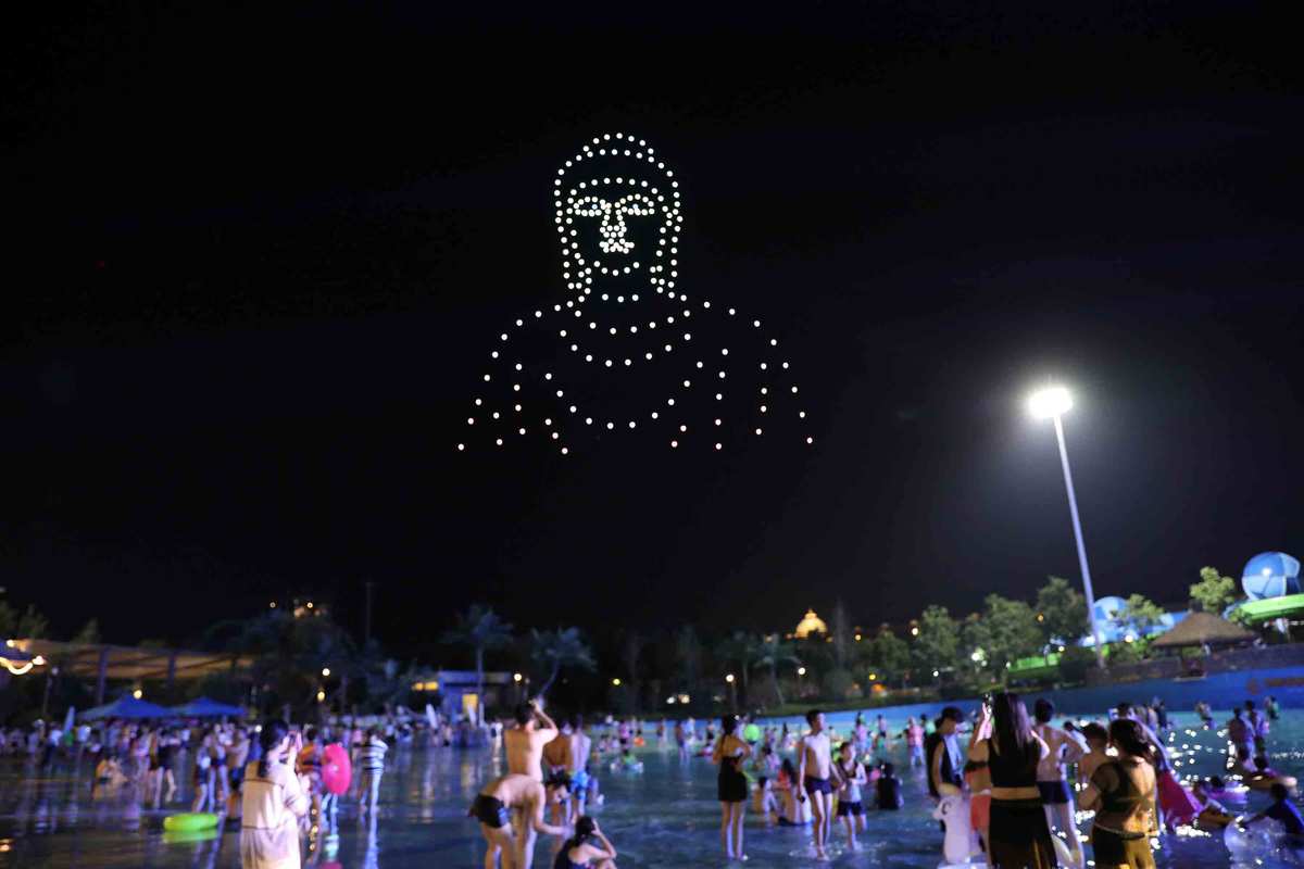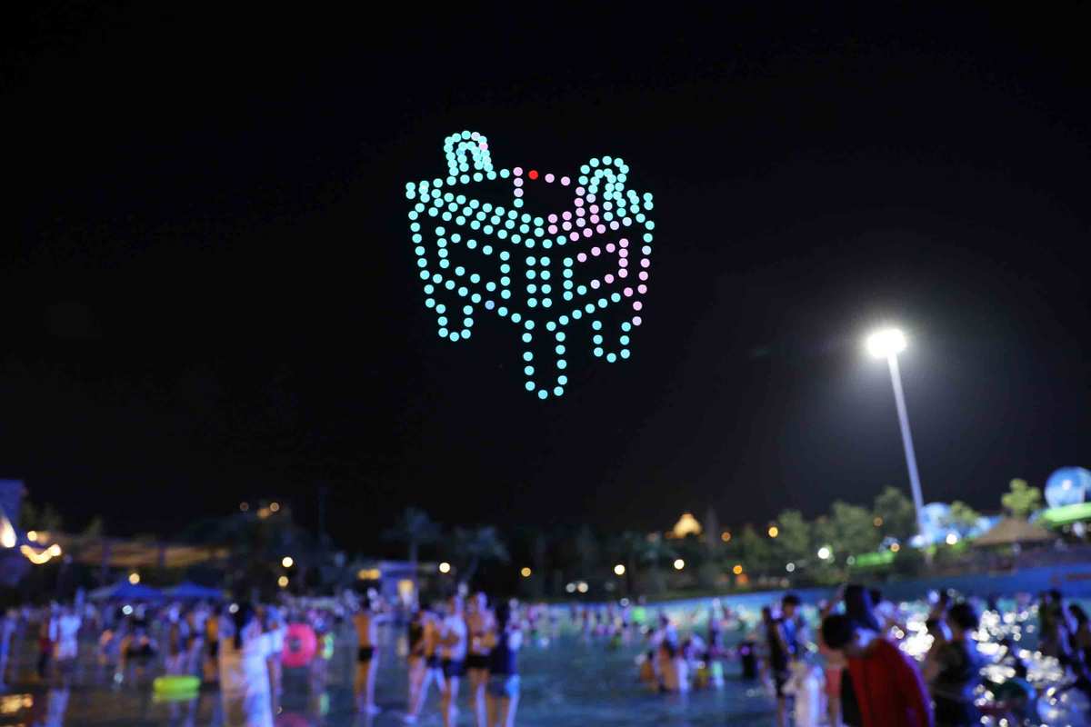 A total of 200 drones create a performance showcasing Henan’s cultural elements in Happy Ocean Water Park, a tourism scenic spot in Xinmi city, Central China’s Henan province, Saturday night, offering a visual feast to visitors. [Photo provided to chinadaily.com.cn]