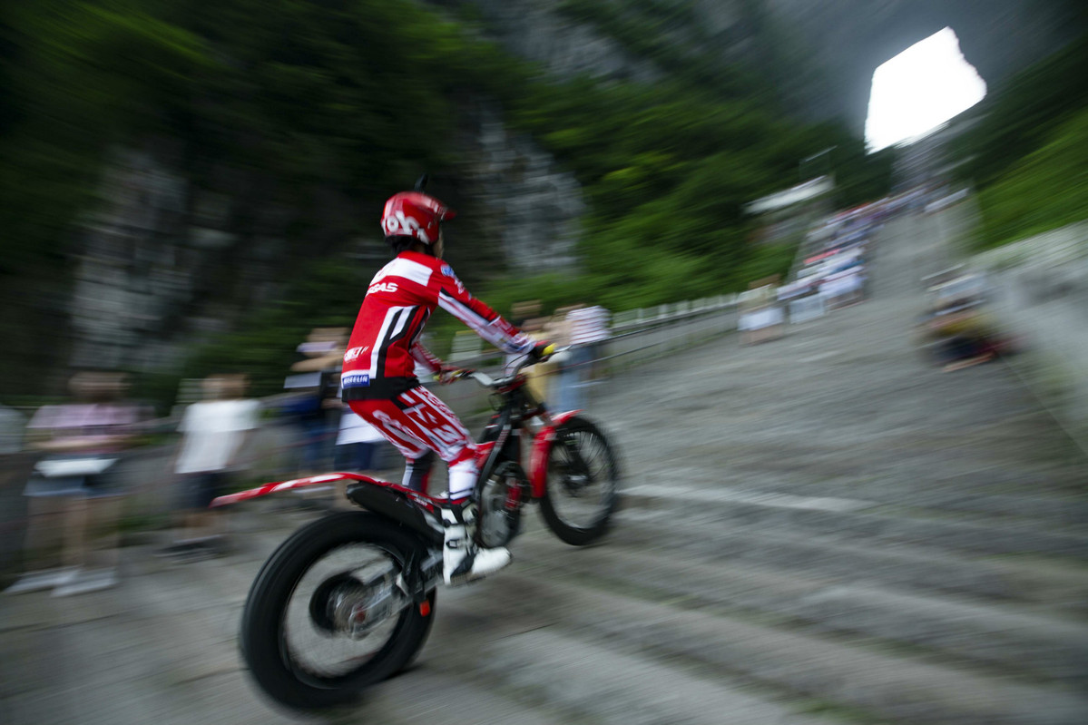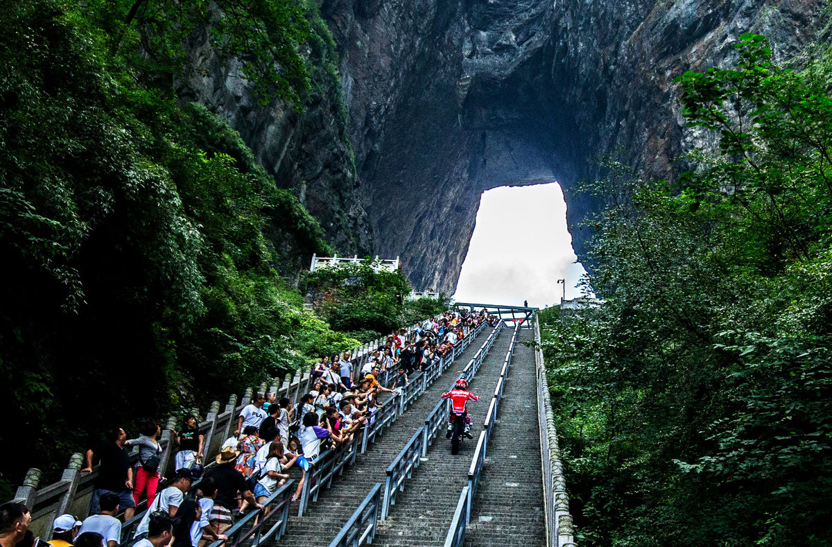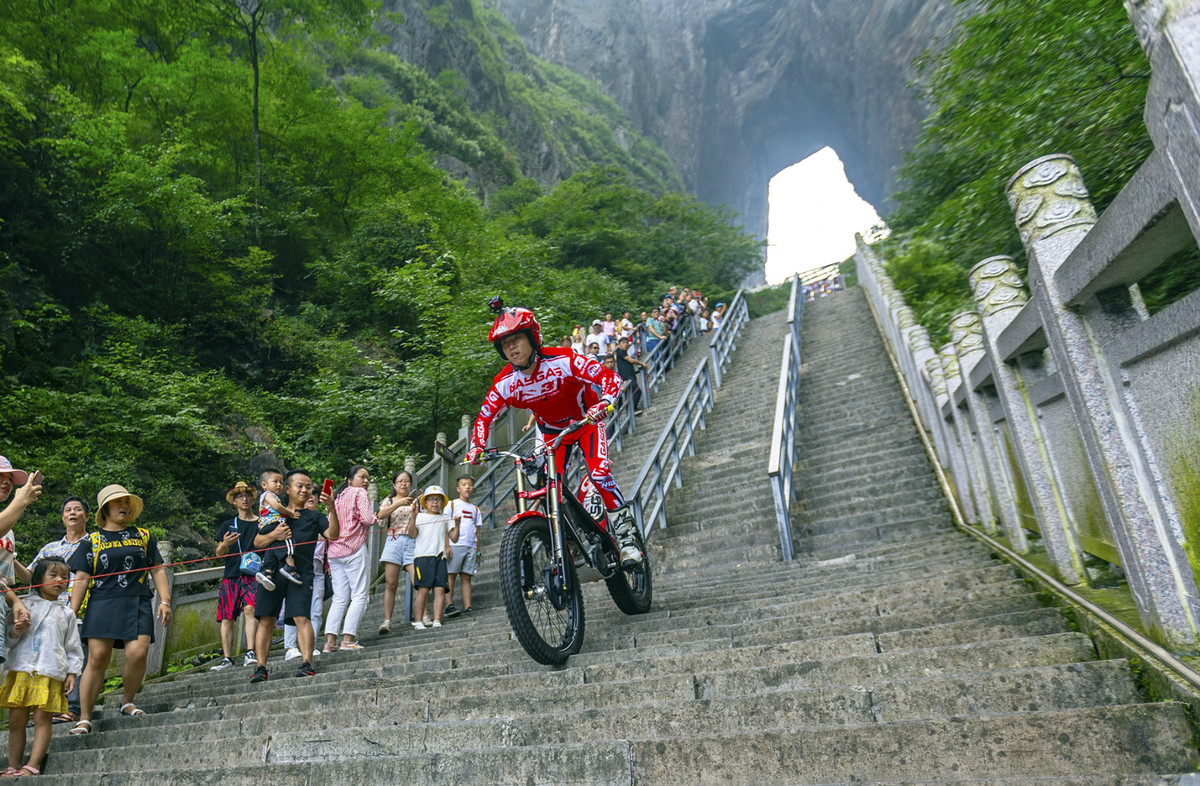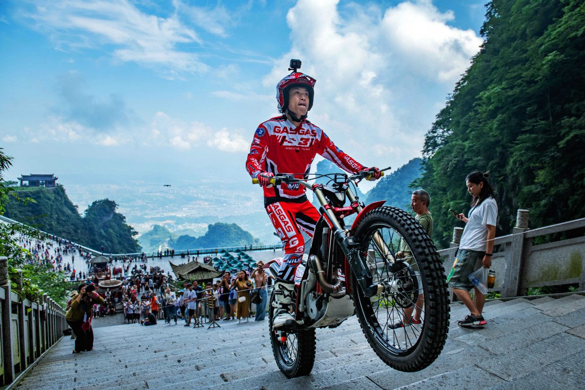 Geng Jie rides his motorcyle down the stone steps he conquered at the Tianmenshan scenic area in Central China's Hunan province. [Photo by Yang Ming/Provided to chinadaily.com.cn]