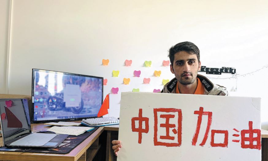 Ullah Inam, a Pakistani student at Henan University of Technology, holds a sign with the slogan "Stay strong, China" to express his appreciation of the government's and people's efforts in fighting the COVID-19 outbreak. Photo provided to China Daily