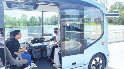Autonomous vehicles have taken to the roads, facilitating people's lives in Henan. The pictures show that people take an autonomous bus in Zhengzhou, Henan province. (Text & Photo: Dahe Daily)