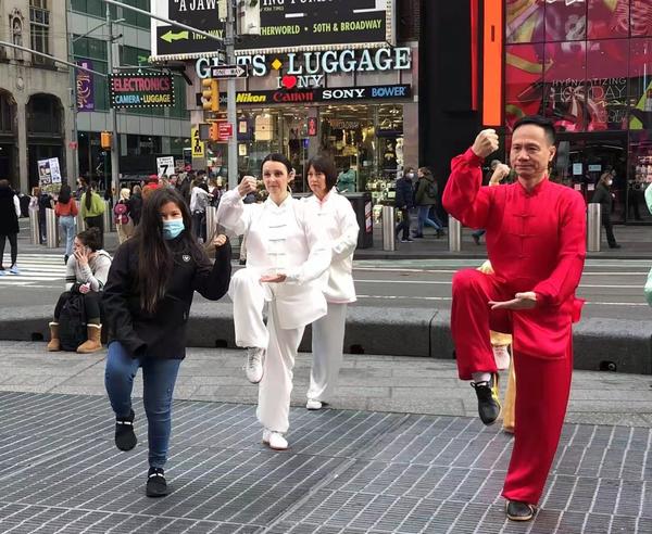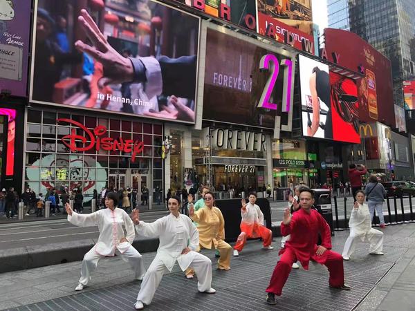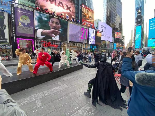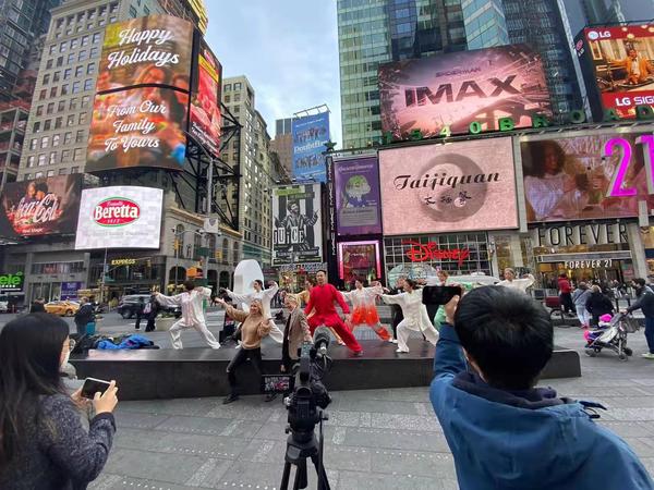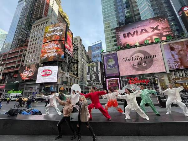 A group of practitioners on December 17 demonstrated Taijiquan, a kind of Chinese traditional martial arts, at Times Square of New York City. This year marks the first anniversary of Taijiquan being listed as intangible cultural heritage of humanity by the United Nations Educational, Scientific and Cultural Organization. (Text: dahe.cn Photo provided to dahe.cn)