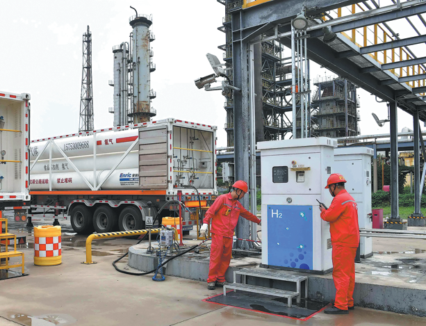 Personnel from Sinopec Zhongyuan Oilfield Company pump hydrogen into a vehicle at a hydrogen production workshop in Puyang, Henan province, on Aug 12, 2024. TONG JIANG/FOR CHINA DAILY