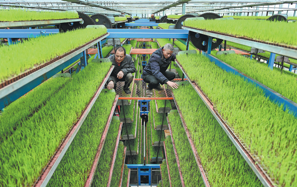 Farmers check the rice growing condition at an intelligent seedling factory in Shaoyang, Hunan province, on March 18. TENG ZHIZHONG/FOR CHINA DAILY