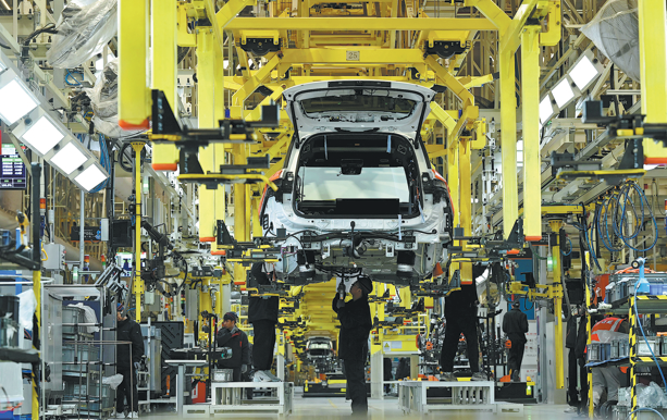 Workers are busy on the assembly line that has been upgraded through intelligent manufacturing for new energy vehicles installation at Lynk & Co's factory in Yiwu, Zhejiang province, on Feb 27. LYU BIN/FOR CHINA DAILY