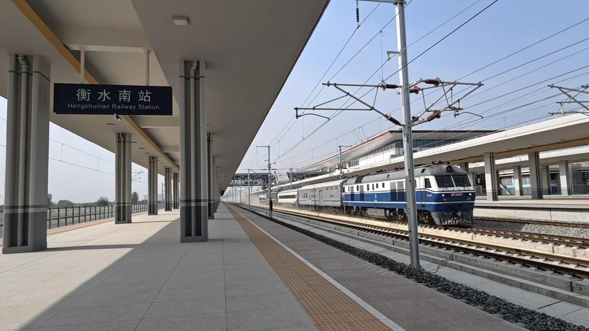 A test train passes by Hengshui South Railway Station. [Photo by Han Xuyang/for chinadaily.com.cn]