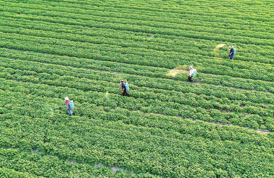 Photo taken on July 13 shows a member of the Qinglong River Cooperative operating a drone to spray foliar fertilizer over rice seedlings in a paddy field in Zhanglou village.